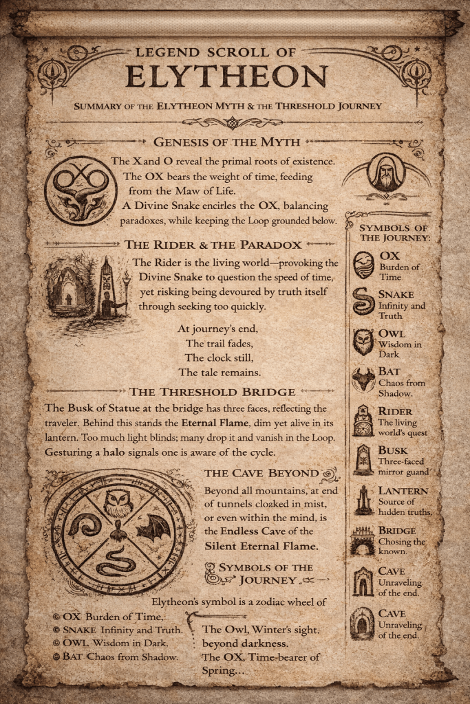 Thus the myth of Elytheon is told: not as a doctrine, but as a compass for the heart. A reminder that choice, truth, and the journey itself make legends of ordinary souls. That beyond every cave of darkness burns a flame worth carrying—but only if one has learned how to hold it without losing sight of life.