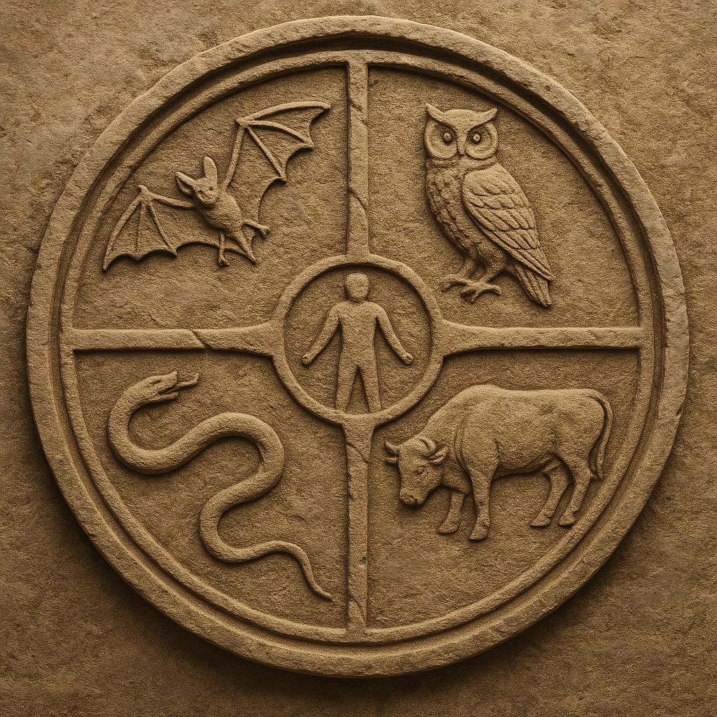 At the center of the wheel stands the traveler. The one who carries the torch, bears the scars, and chooses the path forward or back. Between Snake and Ox lies a crack in the world—a place of tension between infinite truth and burden. And above it all, the Bat tests the soul’s readiness with fear not meant to harm, but to awaken.