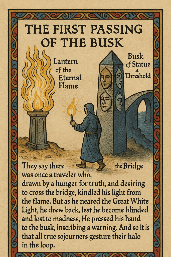 Before the bridge stands the Busk of Statue at Threshold, a tall obelisk smooth on its back, casting a perfect reflection of any who approach on return. Its surface is neither stone nor metal nor glass, but a substance unknown, a final test for the traveler. Behind the Busk hangs the Lantern of the Eternal Flame, a light taken from the first fire of truth itself. Every sojourner must light their torch here before crossing the bridge, for the void ahead swallows all light but this one. Yet this flame carries warning: draw too near to its source and it grows blinding, burning away sight and sense. Many have dropped their light and vanished into the all-and-nothingness beyond. The wise know when to step back, to carry only what can be borne, and to teach without blinding another with too much truth.