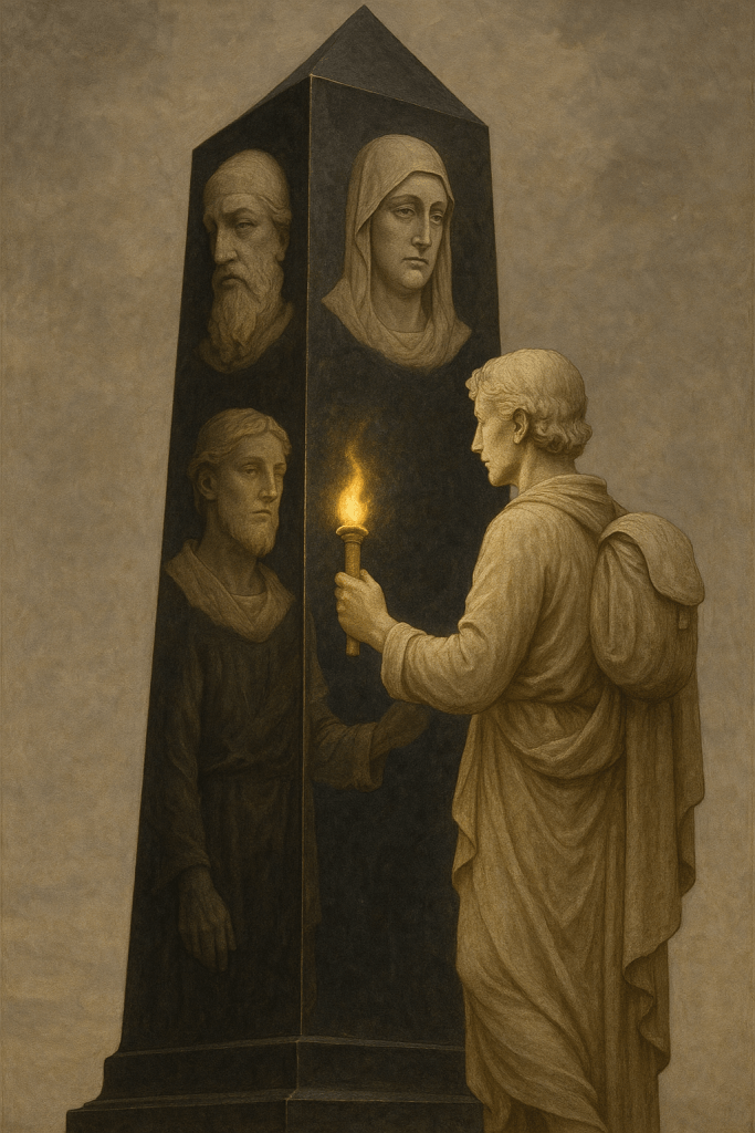 At the start of the journey stands the Lantern of the Eternal Flame. A traveler must light their torch from this source before entering the void. Behind the flame waits the Busk of Statue at Threshold, a three-faced obelisk with one reflective side. There, the self is shown not in vanity, but in weight—the burden of survival, memory, and truth.
